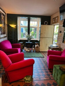 Recovery of a 1930s sofa and two chair in Pass Cerise and jet black piping copy